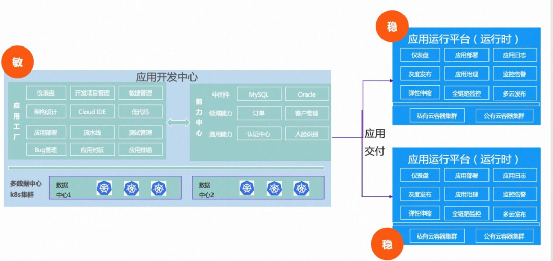 2. 应用运行平台:提供了企业级应用的运行支撑能力,包括多活数据中心的管理与调度、日志能力、运维监控能力等。应用开发中心可以将开发好的应用交付给本企业全世界各地的数据中心,也可以交付给企业的客户或合作伙伴。