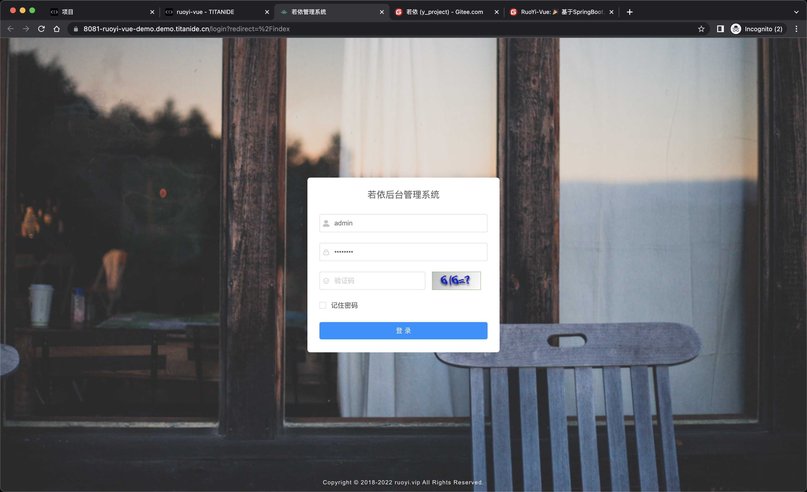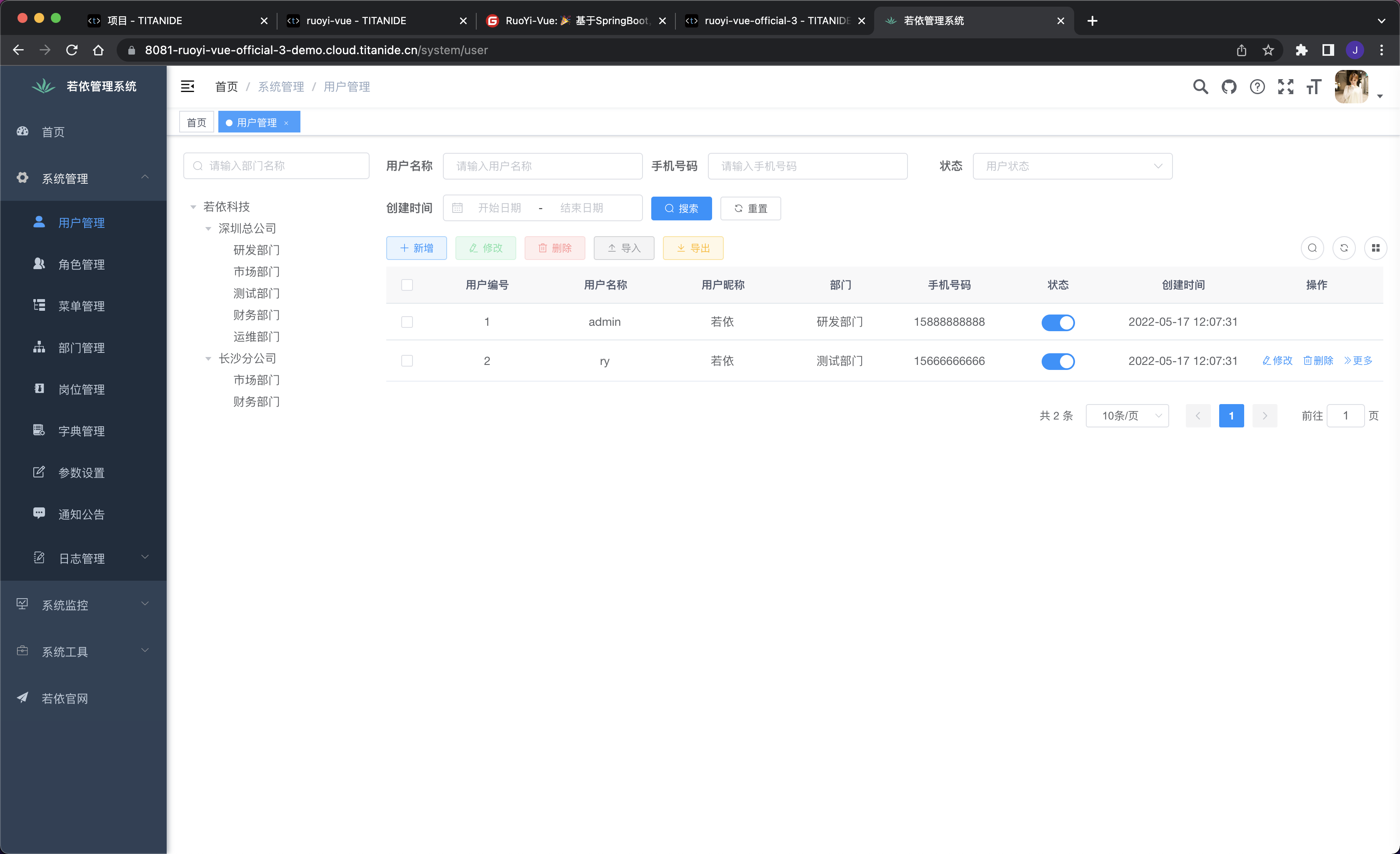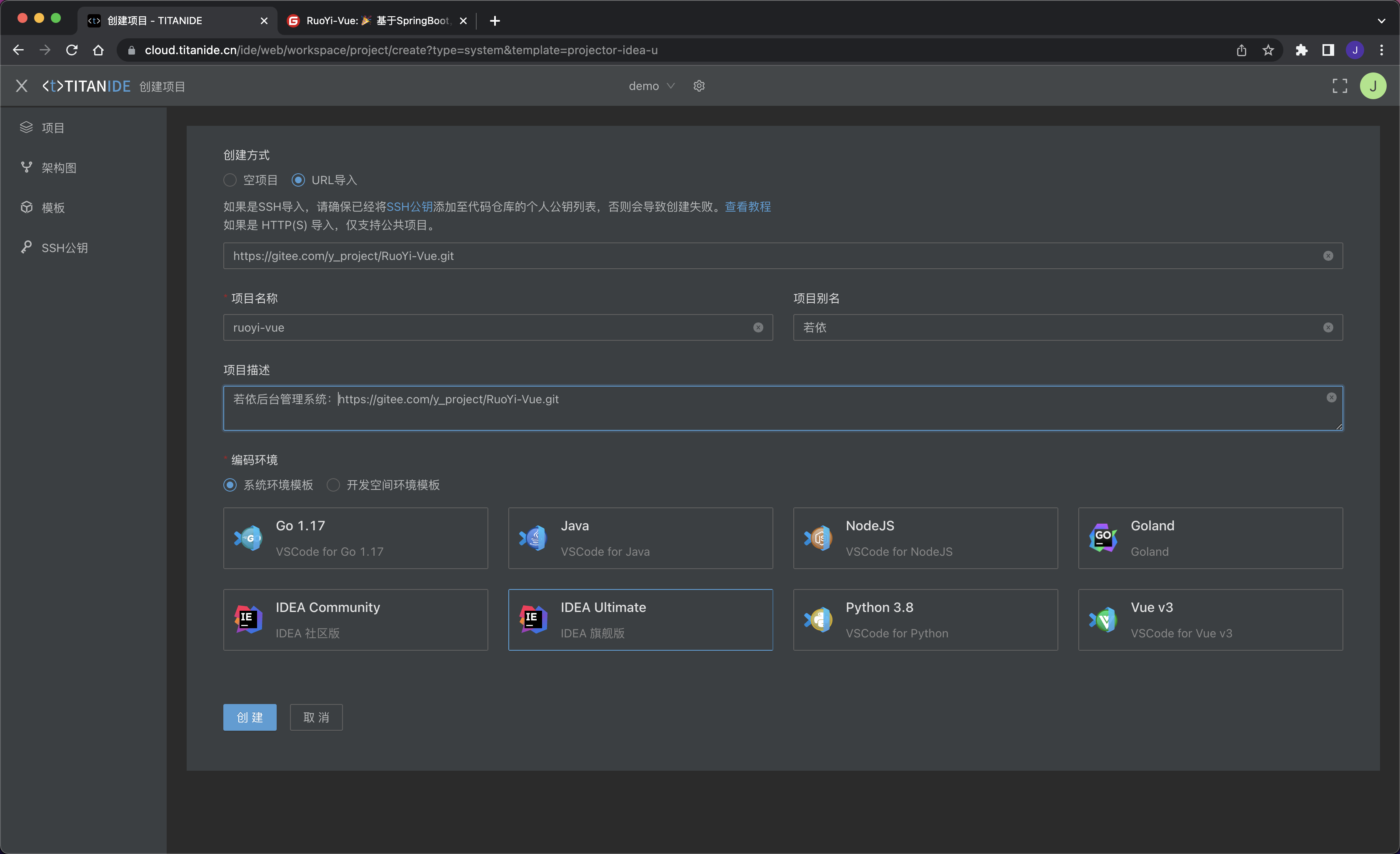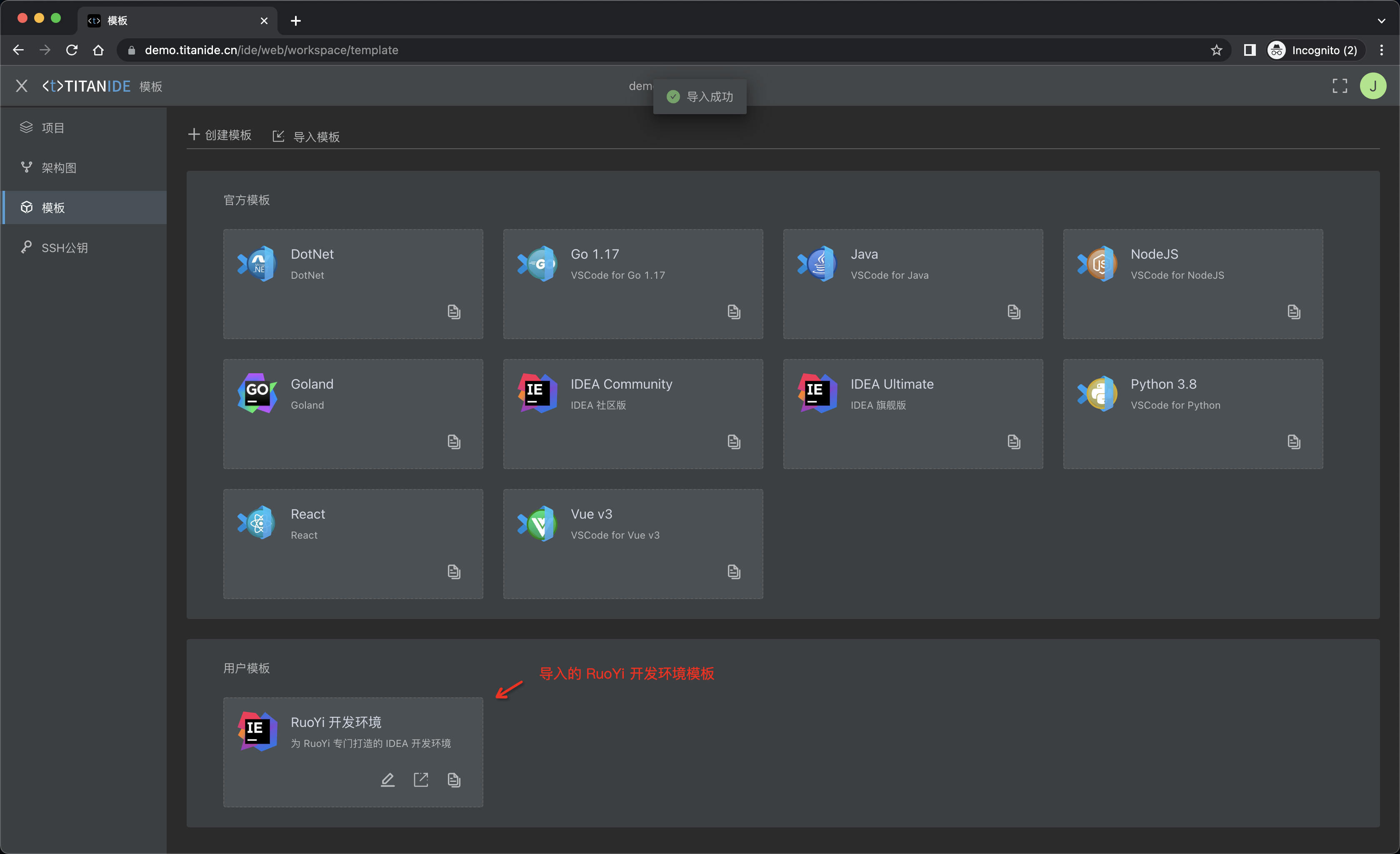我通过 [TitanIDE] 定制了 RuoYi 开发环境模板,然后在另外套环境导入模板并一键创建 RuoYi 的开发环境,在短短的 5 分钟内,一个完整的 RuoYi 开发环境就呈现在您的眼前了。