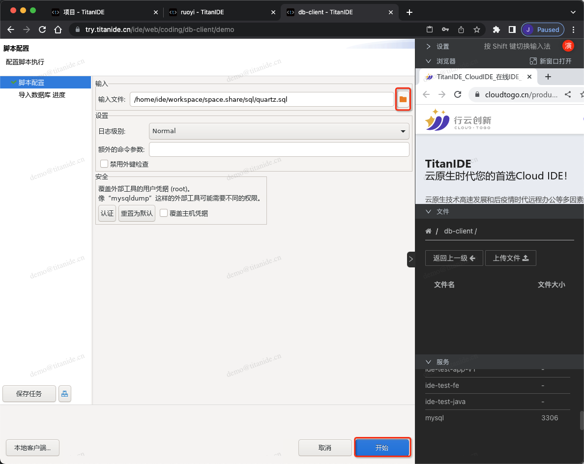 还记得上面我们讲过将数据库SQL脚本导入工作区吗?现在是时候使用这个SQL脚本了,通过输入文件右侧图标打开文件选择框,选择好您要导入的数据SQL脚本,如 /home/ide/workspace/space.share/sql/quartz.sql然后点击【开始】按钮:
