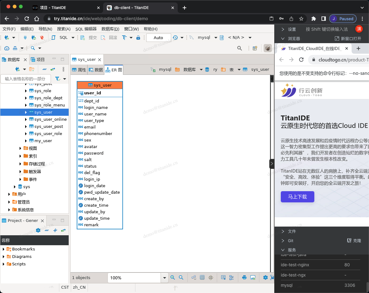 双击左侧树状菜单中需要查看的表,如「sys_user」,右边会显示表的属性、数据和ER图。
